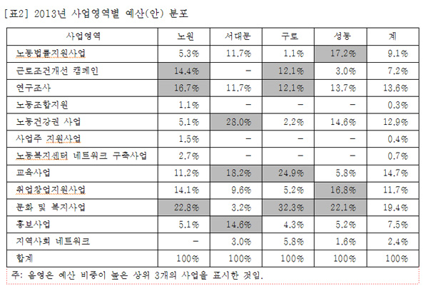 이를 사업영역별로 보면, 다음의 [2]와 같이 크게 13가지로 분류하고 있습니다. [2]를 보면 사업영역 중에 문화복지에 가장 많이 투입되고 있다는 점을 알 수 있습니다. 4개 센터 평균을 내면 19.4%입니다. 그 다음으로, 교육, 연구, 노동건강권 사업 순으로 예산이 투입됩니다. 한편, 가장 많은 예산이 투입되는 문화복지사업 센터별로 편차도 가장 심합니다. 즉 서대문 센터는 예산의 3.2%만 문화복지사업에 투입하고 있고, 구로 센터는 30%가 넘습니다. 연구조사는 3순위로 많은 예산이 투입되는 사업인데 편차는 가장 적습니다.