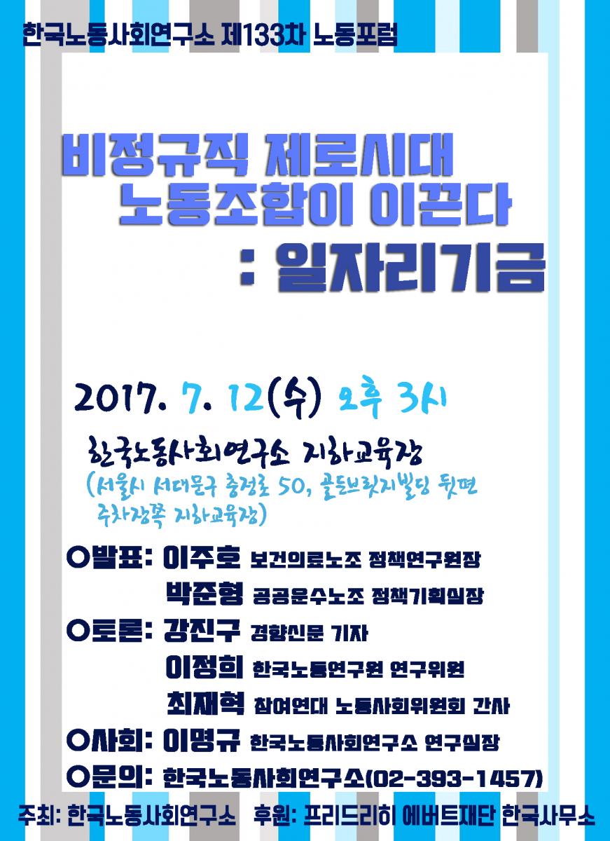 한국노동사회연구소는 오는 7월 12일 오후 3시에 제133차 노동포럼 '비정규직 제로시대 노동조합이 이끈다 : 일자리기금'을 개최합니다.