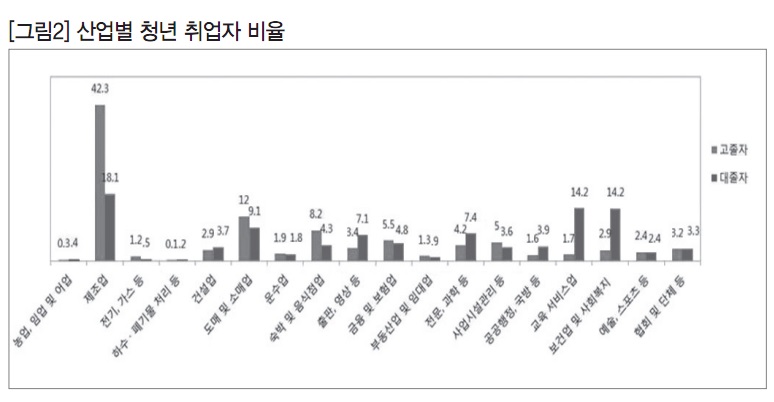 청년 노동자들이 어떤 산업과 직종에서 일하는지 살펴보면, 산업별로 고졸자는 제조업 취업률이 42.3%로 가장 높았고, 도매 및 소매업이 12%를 차지한다. 대졸자도 제조업 취업률이 가장 높았으나 18.1%로 고졸자보다 낮았고, 대신 교육서비스업과 보건 및 사회복지업의 비중이 14.2%로 높게 나타났다. 직종별로 보면, 고졸자와 대졸자 모두 경영·회계 등 사무직 비중이 가장 높았다. 다른 직종의 경우 고졸자는 전기·전자 직종의 취업률이 14.9%, 기계 관련직이 9.9%로 높았다. 대졸자의 경우는 연구 관련직의 취업률이 10.1%, 보건·의료 관련직 취업률이 9.5%로 높은 비율을 보였다.