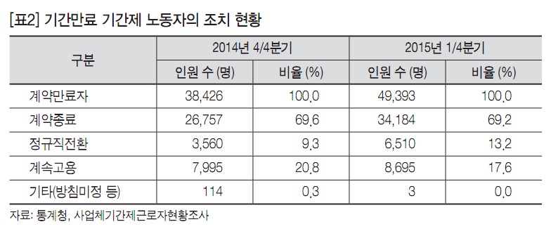 그렇다면 비정규직으로 사회생활을 시작한 노동자 중에서 정규직으로 전환되는 수는 얼마나 될까. [표2]는 계약기간이 끝난 기간제 노동자의 고용이 어떻게 변했는지를 보여준다. 청년 노동자만 국한된 통계는 아니지만, 기간제 근로자를 대표하는 통계인 만큼 참고할 만하다. 계약 기간이 만료된 기간제 노동자 중에서 정규직으로 전환된 비율은 2014년 4분기에는 9.3%였고, 2015년 1분기에는 13.2%에 불과한 것으로 나타났다. 2015년 1분기를 기준으로 보면, 17.6%는 비정규직으로 계속 근무하고 있고, 나머지 69.2%는 계약이 종료된 것으로 나타났다.