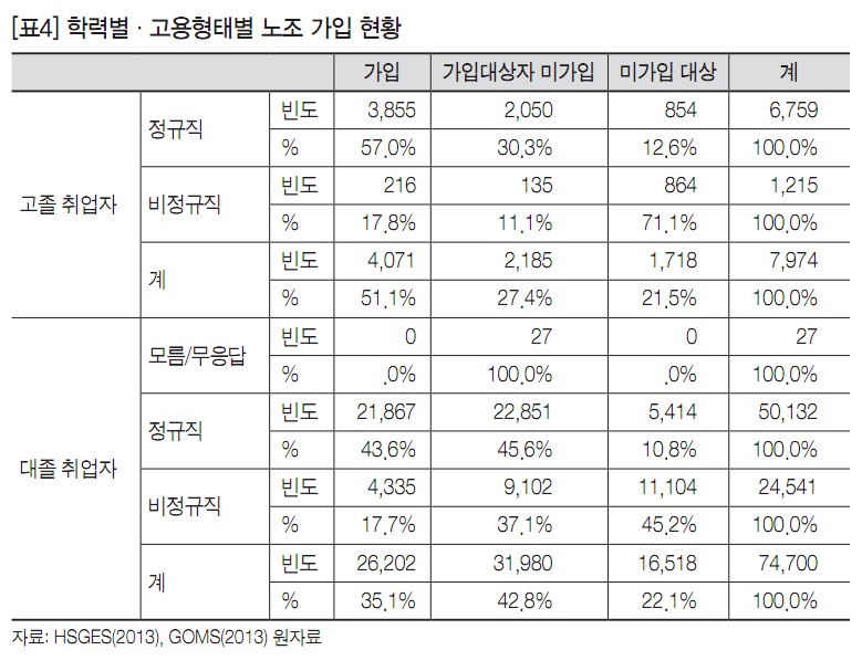 노조 가입률을 학력별과 고용형태별로 교차해서 살펴보면 흥미로운 결과를 얻을 수 있다. [표4]를 보면, 고졸 비정규직은 노조에 가입한 비율이 17.8%에 불과했는데 그 이유는 71.1%가 노조 가입 대상자가 아니기 때문이다. 비정규직이 노조에 가입하지 않은 비율은 11.1%로 낮았다. 반면에 대졸 비정규직의 경우는 고졸과는 내용이 사뭇 달랐다. 대졸 비정규직은 가입 대상자가 아니라는 비율은 45.2%였으며, 가입 대상자지만 노조에 가입하지 않았다는 비율이 37.1%였고, 노조에 가입한 비율은 17.7%로 낮았다. 즉, 대졸 비정규직은 자발적으로 노조에 가입하지 않는 비율이 높은 것을 알 수 있다.