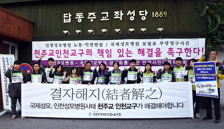 사건 발생 3개월이 지났지만 병원은 모든 대화를 거부했다. 우리는 할 수 없이 국제성모병원과 인천성모병원의 경영주체인 천주교 인천교구가 직접 나서 사태를 해결할 것을 요구하며 인천교구 최기산 주교께 대화를 요청했다. 그러나 인천교구는 ‘병원 일은 교구가 관여하지 않는다’는 입장으로 수차례 면담거부 답변을 보냈다. 할 수 없이 인천교구청이 있는 답동성당 앞에서 1인 시위와 피케팅을 하고 기자회견과 집회 등을 이어갔다. 인천교구 주교와 본당 신부들에게 직접 편지를 두 차례나 써서 호소도 했다. 그러나 5개월이 되어도 병원과 인천교구는 단 한 차례도 대화에 나서지 않았다. 아니, 노조와는 대화하지 않겠다는 입장이라는 얘기만 전해졌다. 보건의료노조의 집중투쟁으로 단 한차례 이뤄진 교구청 관리직 신부들과의 공식 면담에서 “문제의 심각성을 인식했다. 주교님께 일이 잘 해결되도록 노력하는 역할을 하겠다”는 답변을 들은 것이 지금까지 공식 대화의 처음이자 끝이다. 교구 내부적으로는 많은 신부들이 이 사태에 대해 적지 않은 우려를 하고 있다는 얘기도 전해지고 있다.