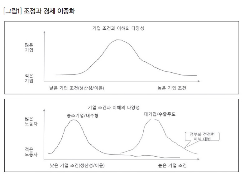 이런 조직화와 조정의 문제는 경제의 이중화에서 더욱 심각해집니다. [그림1]과 같이 정상적인 경제에서 기업들의 상황은 정규분포를 보이고 있다고 가정할 수 있습니다. 그러나 우리나라의 경우 경제의 이중화에 따라 한편에서는 중소기업·내수형 기업이 있고 또 다른 한편에는 대기업·수출주도형 기업이 있습니다. 이들 기업 사이에는 생산성·이윤 차이가 발생합니다. 그런데 정부와 전국경제인연합회는 이 중 하나를 선택해 그들의 이해를 대변하고 있죠.