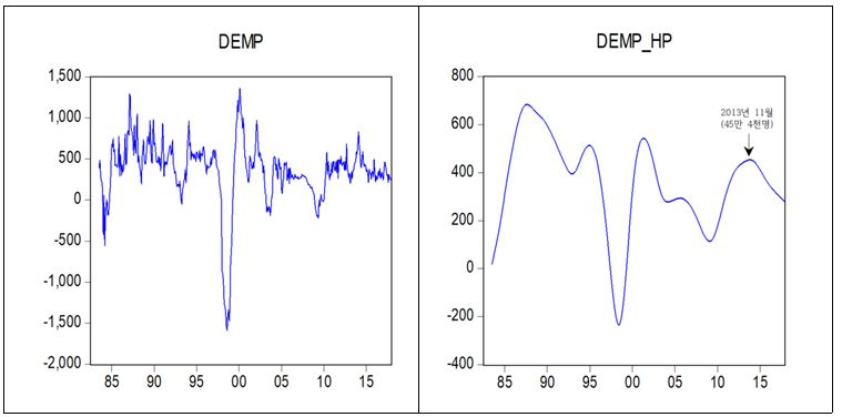 - <그림2>에서 왼쪽 그래프는 전년 동월 대비 취업자 증가를 그린 것이고, 오른쪽 그래프는 HP(Hodrick-Prescott) 필터링을 통해 장기 추세를 그린 것이다. 2013년 11월(45만 4천 명)을 정점으로 2017년 12월(25만 3천 명)까지 취업자 증가세가 둔화되고 있다.