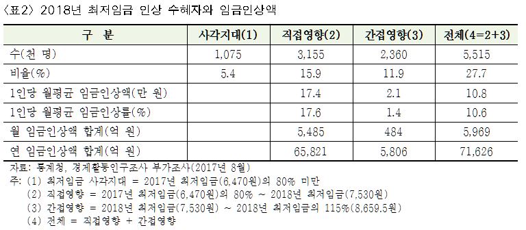 ○ 최저임금 수혜자들의 연간 임금인상액을 합하면 직접영향이 6조 6천억 원이고, 간접영향이 6천억 원이다. 전체 수혜자 552만 명이 받는 연간 임금인상액을 합하면 7조 2천억 원(월 6천억 원)이다. 한국은행 국민소득 통계에서 피용자 보수총액은 2016년 736조 1천억 원이다. 2018년 최저임금 인상에 따른 임금인상액은 전체 노동자 임금총액의 1%에 못 미친다.