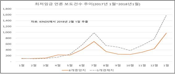 - 2017년 4월까지 최저임금 기사는 8개 중앙지가 5개 경제지보다 많았다. 그러나 문재인 정부가 출범한 5월부터 최저임금 기사는 5개 경제지가 8개 중앙지를 앞지르기 시작했다. 5개 경제지가 쏟아낸 최저임금 기사는 2017년 7월 983건으로 최고치를 기록한 데 이어, 2018년 1월에는 1,579건으로 최고치를 갱신했다. 특히 서울경제신문은 지난 1년 동안 최저임금 기사를 1,817건 쏟아냈는데, 2018년 1월 한 달 동안 551건의 기사를 내보냈다(<그림1>과 <부표1>, <부표2> 참조).