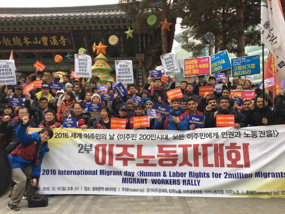 (2016년 12월18일 ‘세계 이주민의 날’을 맞이하여 광화문역 인근에서 열린 이주노동자대회에 참석한 이주노동자들. ⓒ이주노조)