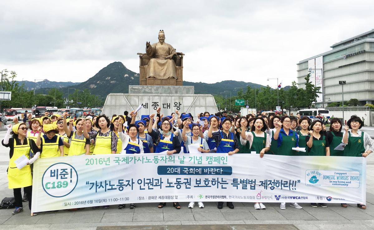 (가사노동자들이 2016년 6월16일 광화문 광장에서 국제가사노동자의 날 기념 캠페인을 벌이고 있다. ⓒ전국가정관리사협회)