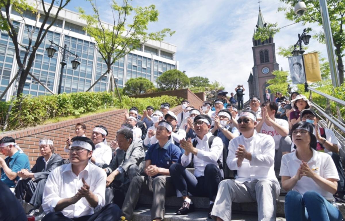 (사무금융노조가 2017년 6월10일 명동성당 앞에서 ‘넥타이부대’ 재현 행사를 진행 중이다. ⓒ사무금융노조)