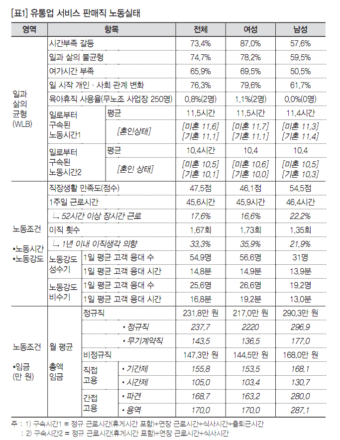 유통업 서비스 판매직의 장시간 노동체제는 육체적, 정신적 건강을 위협하는 것은 물론, 최근 사회적 문제로 불거진 감정노동과 관련하여 매우 심각한 상황을 초래하고 있다. 그럼에도 유통업 서비스 판매직 노동자의 노동조건은 중층적인 고용구조(입점협력업체, 간접고용)로 인해 쉽게 개선되지 못하고 있다.