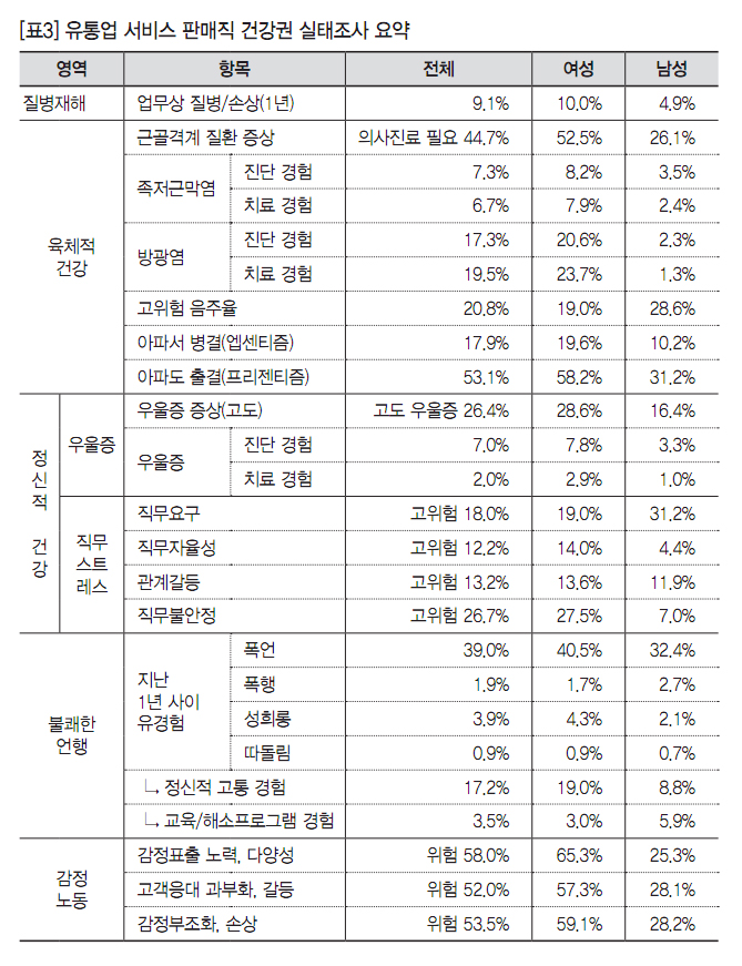 유통업의 감정노동 문제는 단순히 고객으로부터의 불쾌한 언행만이 아니라, 기업과 조직의 적절한 대응 부재와 과도한 고객 서비스, 인사관리 정책이 만들어낸 사회적 산물이다. 특히 유통업 서비스 판매직 노동자들은 매뉴얼과 규칙에 따라 서비스를 제공하는 과정에서 감정을 조정하고 통제(직무요구 스트레스 고위험군 18%) 해야 하는 탓에 ‘감정적 부조화’로 인한 건강장애를 겪을 개연성이 높다.