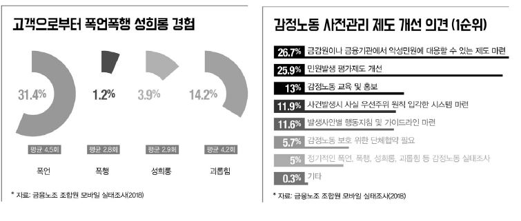 이러한 상황임에도 불구하고 금융산업 현장에서 감정노동 문제 해결을 위한 제도화는 더딘 편이다. 지난 2016년 국회에서 금융산업 관련 6개 법률에 고객응대 종사자의 보호 조치가 법률에 통과되었음에도 현실에는 평가와 모니터링 등에 의해 작동되지 않고 있다는 의견이 많다. 첫째, 금융산업 노동자들은 지난 6개월 사이 직장 업무를 수행하면서 고객의 무리한 요구를 수용한 경험이 절반(51.7%)이나 되었고, 수용한 이유는 고객의 협박위협(35.4%) 때문으로 이로 인해 근무의욕 저하(38.1%)나 업무지연과 방해(30.6%)라고 인식하고 있었다. 둘째, 금융산업 노동자들은 일상화된 금융권의 CS 평가가 고객서비스에 도움이 안 되는 것으로 인식(100점 만점 중 28.2점)하고 있었고, 실적평가에도 도움이 안 되는 것으로 인식(100점 만점 중 24점)하고 있어, 제도개선 필요성(폐지 31.3%, 인사평가 반영 규제 19.5%)을 갖고 있다.