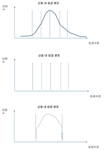 산별 임금 표준화의 방식과 관련해 세 가지 이슈가 있습니다([그림 2] 참조). [그림 2]의 첫 번째 그래프를 보면 종 모양인데요, 동질성을 확보하려는 노력이 없을 때 임금 차이가 연이어 나타나는 정규분포를 나타냅니다. 임금동질성을 높이기 위해서는 두 번째 그래프처럼 임금 분포를 몇 개의 선으로 집약시켜 표준임금을 만드는 것이 중요합니다. 중요한 것은 하나 또는 복수의 표준임금이 있다면 무엇을 그 기준으로 할 것인가 입니다. 산업 수준에서 근속으로 하는 것이 맞을까 아니면 직무가치에 따라서 임금을 표준화하는 게 맞을까하는 여러 가지 고민이 있을 수 있습니다. [그림 2]의 세 번째 그래프는 동질성을 확보하기 위해서 하위임금을 높이고 상위임금을 낮추는 방향을 나타냅니다. 어려운 것은 상위임금을 낮추는 문제입니다. 이를 해결하기 위해서는 사회적 협의에서 임금상한선을 두거나, 초기업단위 교섭에서 연대임금을 설정하고 협약적용을 확대하거나 근로감독을 강화하는 방법들이 있을 것입니다.
