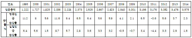 [표 1]에서 우리나라 평균임금 추이를 보면 1995년 민주노총이 만들어지고 나서 노동자 월평균 임금은 122만 원에서 2014년 357만 원으로 약 3배 정도 올랐습니다.