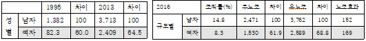 우리가 노동조건의 동질성과 차이를 얘기할 때 몇 가지 기준이 있습니다. 이 기준은 우리가 만든 것이 아니라 통계청이 만든 것입니다. 첫 번째 기준인 성별 임금의 차이를 보면, 남자와 여자의 임금차이는 1995년 100대 60에서 2013년 100대 64.5로, 격차가 40%p에서 35.5%p로 줄었습니다([표 2] 참조). 다시 말하면 노동조건의 동질성이 조금 개선되었다라고 말할 수 있습니다. 2016년 기준으로 무노조 사업장과 유노조 사업장의 남녀 성별 임금 차이를 비교해보면, 공통적인 점은 노조의 유무와 상관없이 개선되었고, 노조가 있는 사업장에서 개선의 정도가 높았습니다. 이를테면 노조가 노동조건의 동질성에 어느 정도 영향을 줬다고 말할 수 있습니다. 또한 남성에 비해 여성에게 노조 효과가 더 높은 것을 알 수 있습니다.