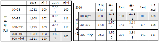 임금동질성을 측정하는 또 하나의 기준은 사업체규모별 임금체계입니다([표 3] 참조). 종단적으로 보면, ‘10~29인 이하’를 100으로 했을 때 1995년에 비해서 2014년 차이가 확대됐음을 확인할 수 있습니다. 노동조건의 동질성이 개선된 것이 아니라 개악된 것입니다. 특히 무노조 사업장을 보면 정말 엉망입니다. 규모별 임금동질성이 무노조 사업장에서 엄청나게 악화됐습니다. ‘30인 이상’과 ‘300인 이하’ 무노조 사업장을 비교해보면 2배가량 차이가 납니다. 유노조 사업장은 규모별 임금 차이가 훨씬 더 적습니다. 여러 가지 논쟁이 있을 수 있겠지만 20년의 변화를 비교해 보면, 노조효과는 대기업보다 30인 미만 사업장에서 오히려 더 큰 것을 알 수 있습니다.