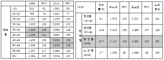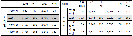 2016년을 보겠습니다. 고졸을 기준으로 두고 보면, 무노조 사업장에서 대졸 이상은 162로 노동조건의 동질성이 악화되었지만, 유노조 사업장은 대졸 이상이 137로, 학력별 임금격차가 완화되었습니다. 노조효과가 중졸, 전문대, 대졸이 아니라 고졸에서 극대화되는 것을 알 수 있습니다. 1987년 노동자대투쟁 이후 노동조합의 주축세력이 경공업에서 중공업 노동자로 옮겨갔고, 공공부문, 금융을 중심으로 조직화가 이루어진 것을 고려하면, 공고, 상고를 졸업한 노동자대투쟁의 주력부대들이 노조운동을 통해 임금을 올린 것으로 추정해볼 수 있습니다.