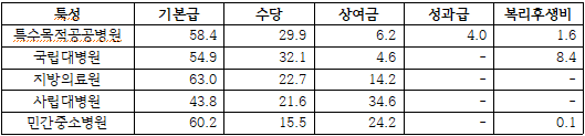 [표 9] 병원특성별 임금구성비 (단위: %)